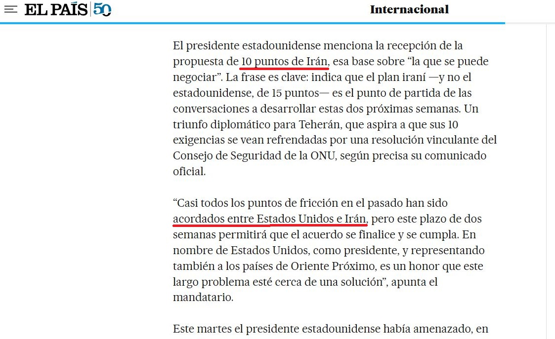 La leemos completa y parece una capitulación de Irán. Justo lo que El País quiere hacer tragar a sus lectores. Se habla de «apertura de Ormuz» que, insistimos, solo se cerró para EE.UU., Israel y potencias sumisas a los dos agresores, pero nada de las diez condiciones hechas públicas por Irán…