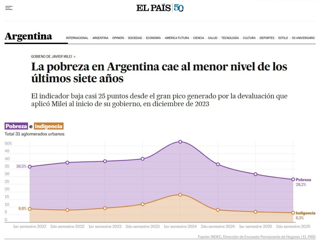 «En el segundo semestre de 2025, la pobreza descendió en Argentina hasta el 28,2%, un registro que es el más bajo de los últimos siete años y que representa una reducción de 3,4 puntos porcentuales respecto del semestre anterior y de casi diez puntos respecto de un año atrás […]