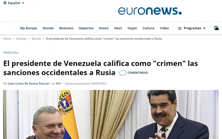 Tras la reunión de una delegación diplomática de Estados Unidos con el Gobierno de Venezuela y la disposición del país Bolivariano a vender más petróleo al ahora necesitado Gobierno que dirige Joe Biden podemos afirmar sin ningún temor que las satanizaciones en base a supuestos «ideológicos» son una farsa. Solo un detalle recogido en el citado programa de La Base (min. 18:30): en «Más vale tarde» de La Sexta o en «El programa de Ana Rosa» de Telecinco se menciona ahora a Nicolás Maduro como «presidente de Venezuela», tras muchos años calificándolo como «dictador». Recojo otro significativo apunte: cómo la agencia euronews ha cambiado su titular inicial Maduro tilda de «crimen» las sanciones contra Rusia por invasión a Ucrania y lo modifica sutilmente por El presidente de Venezuela califica como «crimen» las sanciones occidentales a Rusia. El primero aún presente en algún medio (DW) que difundió rápido la nota de la agencia;