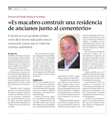 En realidad las declaraciones de Pompa han sido algo más tangenciales. Según publica hoy ABC, citando despachos de agencia, Pompa manifestó a preguntas de los periodistas que «el Ayuntamiento emplea su dinero para destinarlo a lo que considera oportuno y ha recordado que parte de los terrenos donde se construyen esas viviendas eran municipales y fueron adjudicados a la cooperativa». A esto, refiriéndose al asunto de la residencia de ancianos junto al cementerio, ha añadido, zambulléndose definitivamente en lo grotesco bien aderezado con lo macabro, que «duda de que desde la futura residencia… se pueda ver el cementerio, puesto que en medio hay unos chalets».