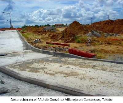 Estos, no obstante, no son los únicos negocios del empresario conquense que amenazan ruina. Otros de menor volumen, como el PAU de Las Montanillas en Carranque (Toledo) ya están en situación de semiabandono o de abandono completo, lo cual no es raro teniendo presente el endeudamiento insostenible que reflejan las cuentas de DESARROLLOS URBAPLANING, la sociedad de González Villarejo con la que éste actúa en el citado PAU y también, con la que pretendía trabajar en el de las 24.000 viviendas de Illescas, también en Toledo.