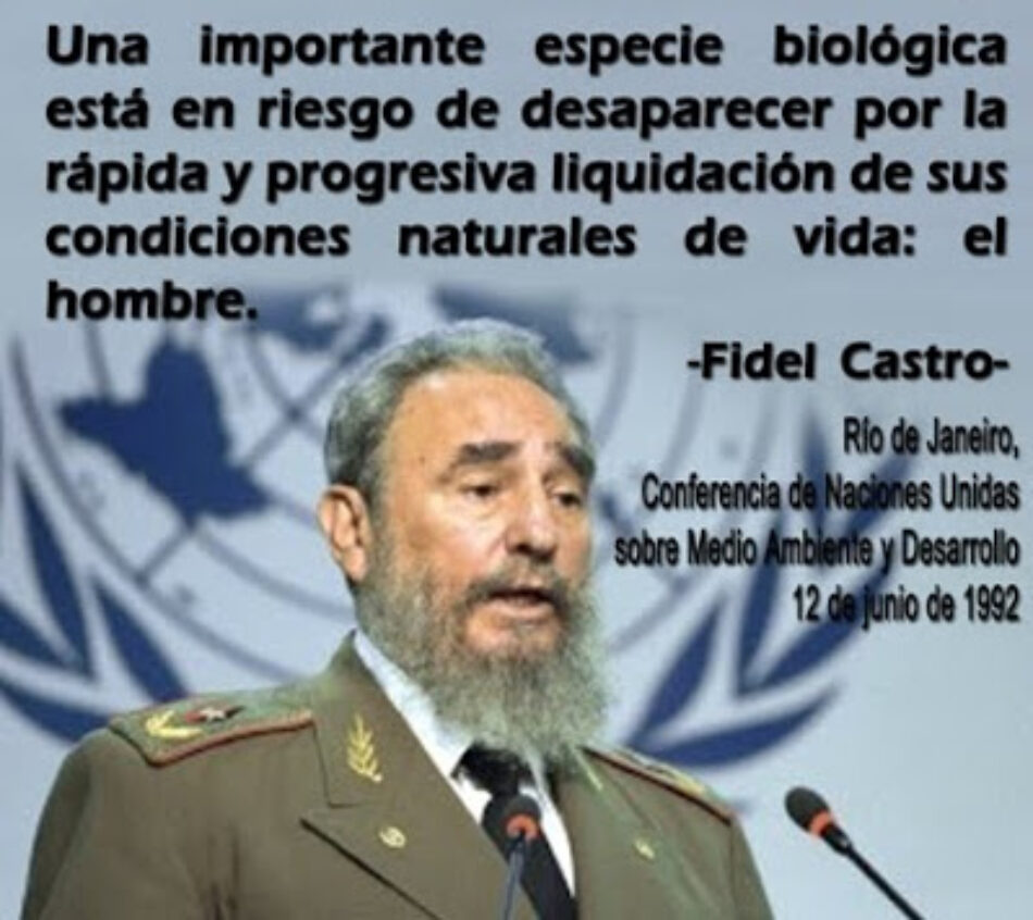 A propósito y en esta fecha, son muy oportunas las palabras del Comandante en Jefe, Fidel Castro Ruz, cuando, con su visión global, intervino en varias reuniones mundiales sobre el tema.
