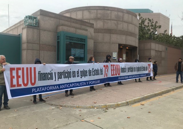 Coordinados en la Plataforma Anticapitalista y Popular, las y los luchadores antiimperialistas dijeron en las puertas de la embajada estadounidense en Chile que, «Por eso el Departamento de Estado de Estados Unidos y sus mandarines, desde mucho antes del golpe de Estado del 73, y al igual que en otros países de Latinoamérica y el mundo, financió y planificó detalladamente la aparición de bandas fascistas, la propaganda mediática contra los derechos populares, las acciones de sabotaje, la compra de representantes gremiales, de políticos, del alto mando de las Fuerzas Armadas y las policías, del sicariato, del lumpen-empresariado. Estados Unidos no puede tolerar la autodeterminación de los pueblos. Sus intereses inhumanos no se lo permiten.