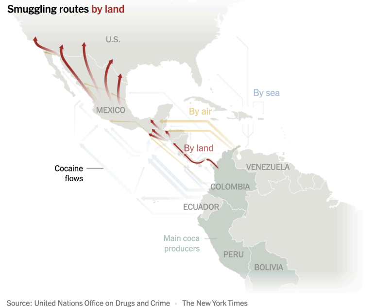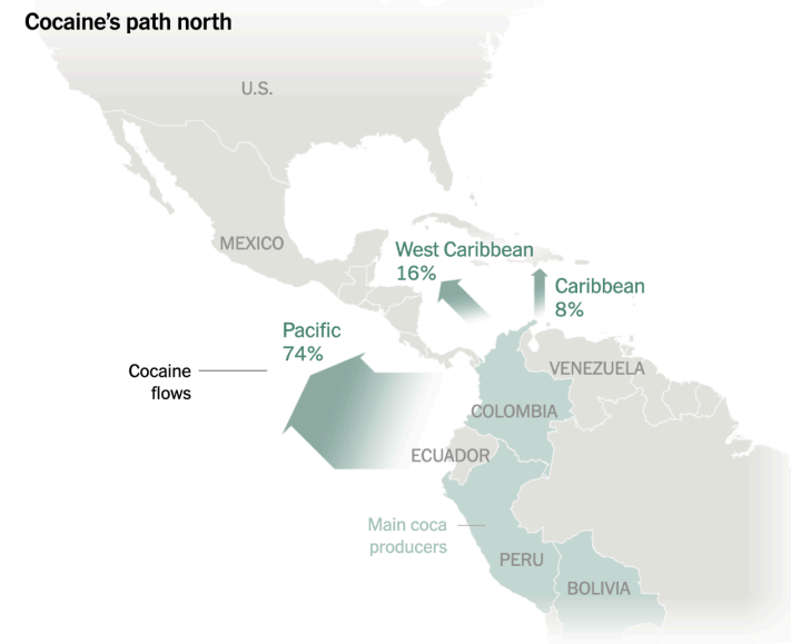 El New York Times reconoce en su propio análisis lo que las cifras oficiales de Naciones Unidas y de la DEA vienen registrando desde hace años: el tráfico de cocaína que abastece al mercado estadounidense no tiene a Venezuela como eje, ni en la producción ni en el tránsito. La cartografía publicada por el diario estadounidense muestra con claridad que las principales rutas del narcotráfico atraviesan el Pacífico, no el Caribe, y que su origen se concentra en Colombia, Perú y Bolivia, los tres grandes productores de hoja de coca del continente.