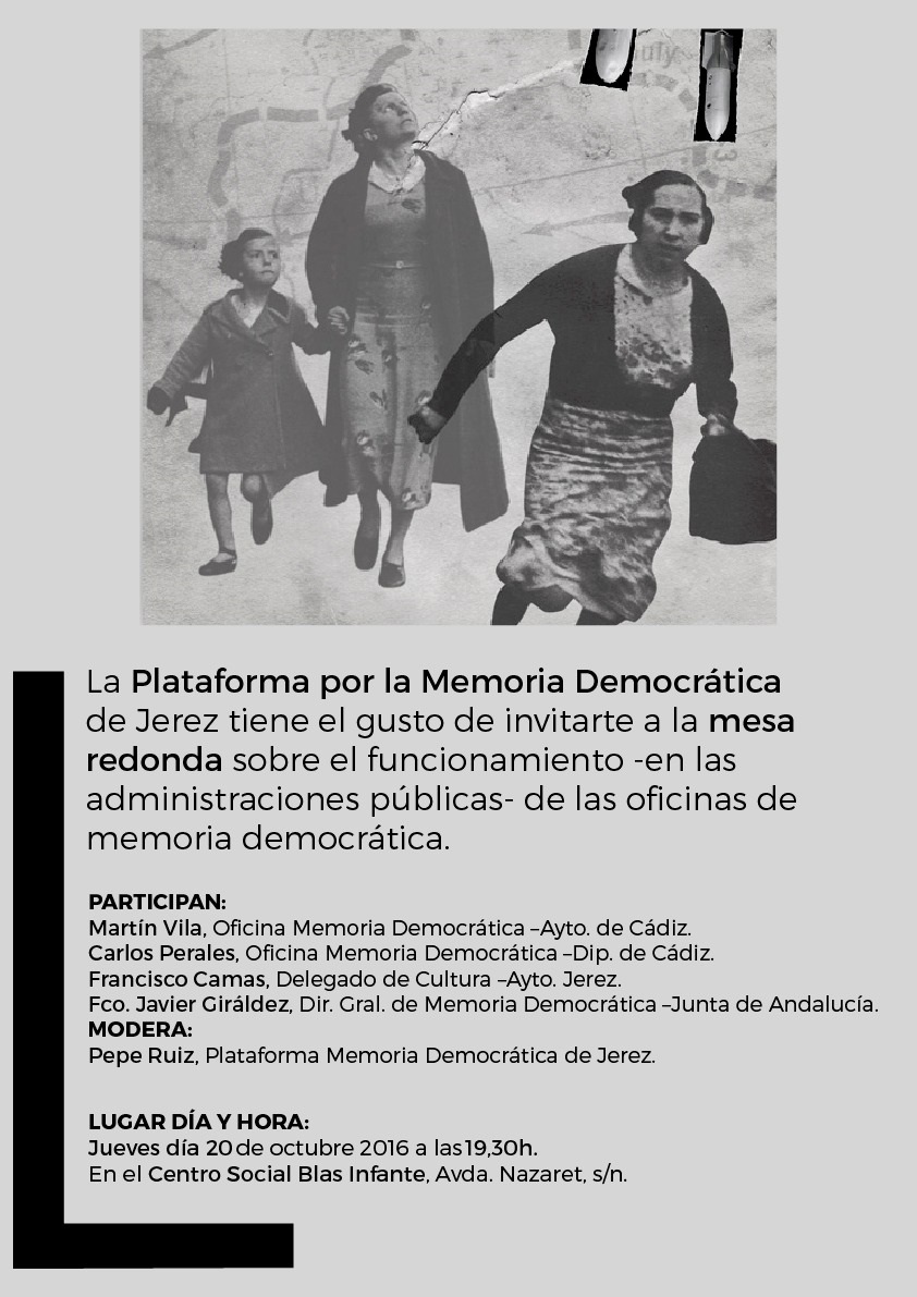 La Plataforma por la Memoria Democrática de Jerez, buscando el objetivo de que también en el Ayuntamiento de nuestra ciudad se ponga en marcha una oficina municipal de memoria democrática, ha organizado un debate para que todos y todas conozcamos cómo, dentro de la administración pública, funcionan esas oficinas, qué hacen, cuáles son sus objetivos, sus medios, etc.