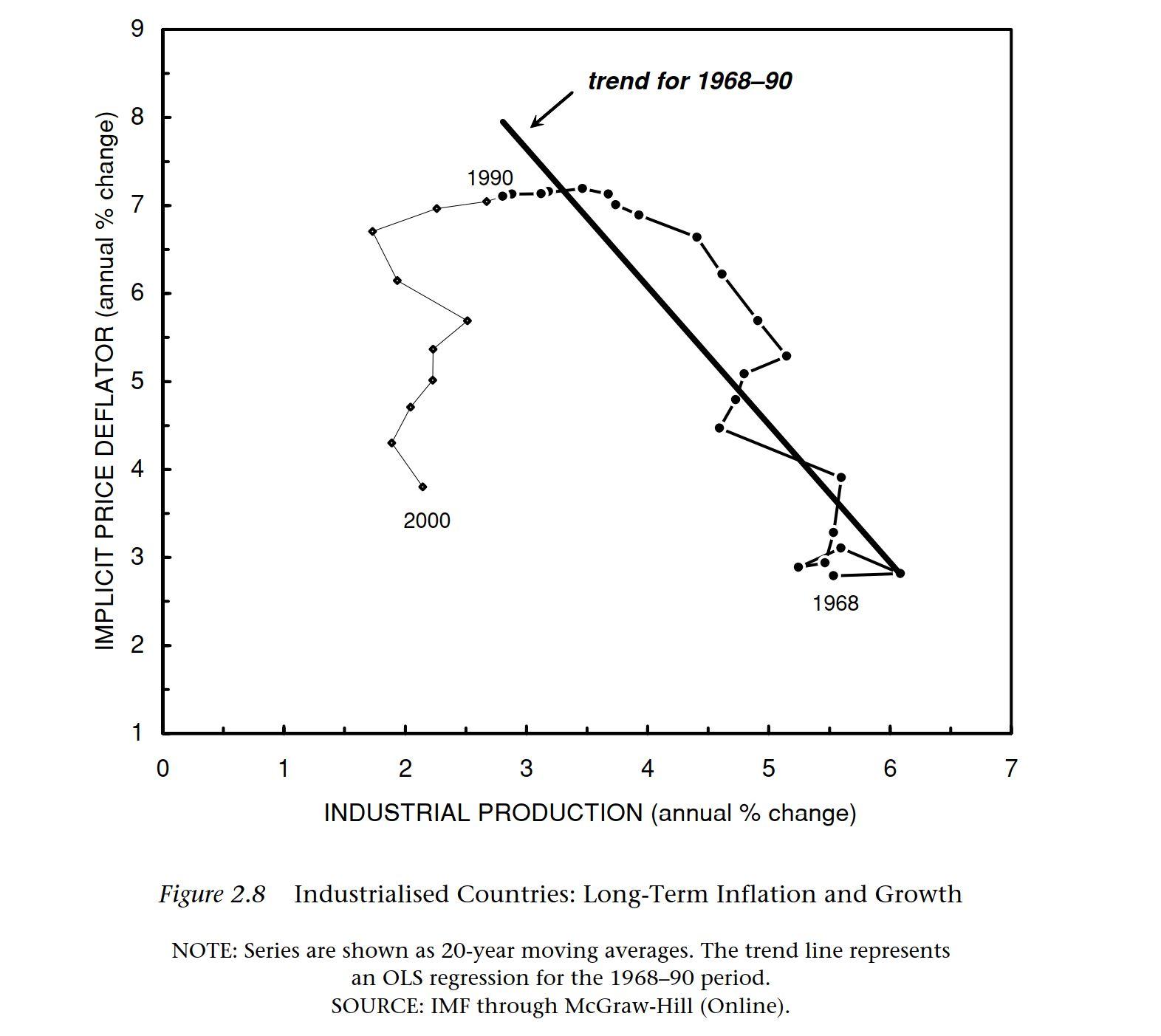 Esta figura muestra la relación a largo plazo entre las medidas convencionales de inflación y el crecimiento económico en los EE. UU. (serie suavizada como promedios de 20 años).