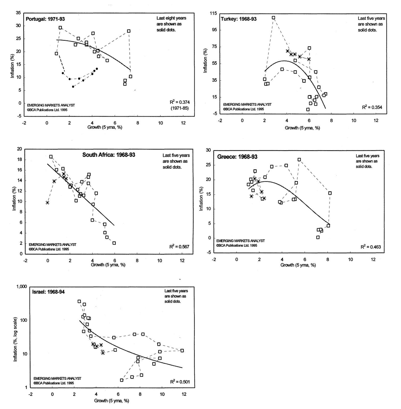Esta inversión no se limita a los EE. UU. Durante el período de posguerra, la correlación negativa entre crecimiento e inflación parece haberse convertido en la regla y no en la excepción. Aquí está la relación inflación-crecimiento en los países industrializados ( https://bnarchives.yorku.ca/8/ )