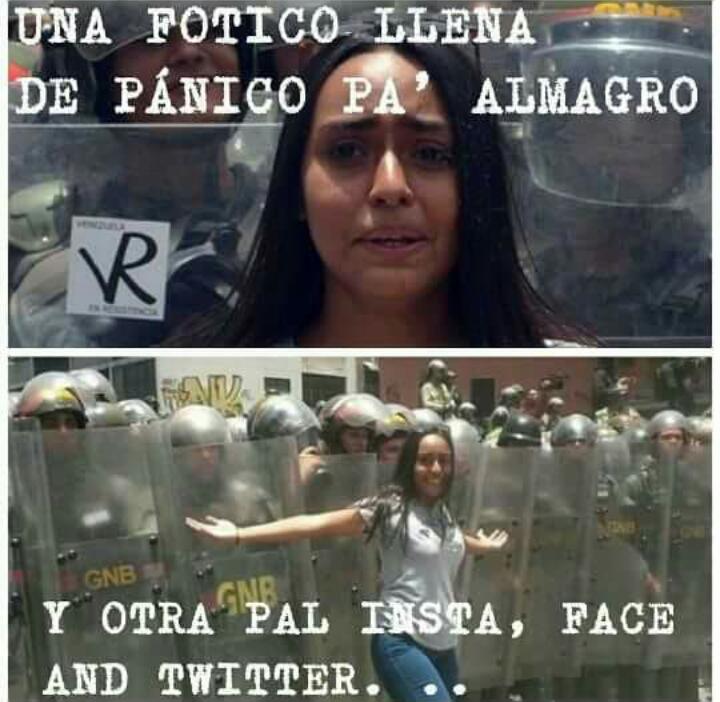 También hemos visto imágenes como la de esta chica que nos sirve de ejemplo, aunque si buscan en la red pueden encontrar decenas de imágenes similares, en la que en una foto aparece alegre y sonriente ante la policía y en otra aparece con cara de miedo ante los mismos policías. La segunda foto fue usada por CNN para mostrar al mundo el miedo con el que se estaba viviendo la feroz represión en Venezuela.