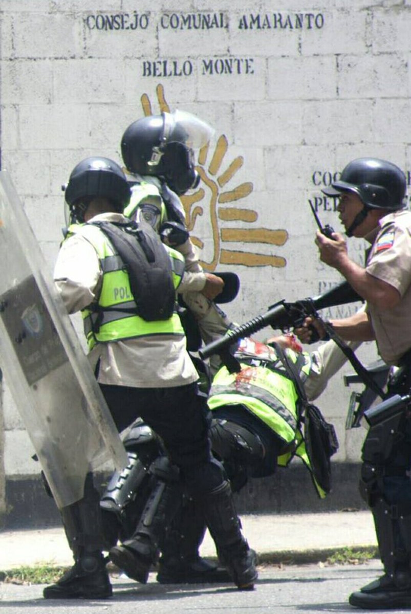 Habitualmente la policía venezolana se enfrenta a tiroteos durante las manifestaciones, ya que entre los manifestantes opositores a veces operan elementos armados que disparan contra los agentes. En el siguiente vídeo se observa uno de esos casos en el que se pueden escuchar los impactos y silbidos de las balas alrededor de los policías.