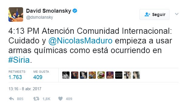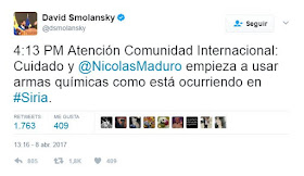 Vamos ahora con otro tema. Tras el ataque de EEUU a Siria en respuesta al supuesto ataque químico que había ocurrido en el país, rápidamente algunos opositores, entre los que hay cabezas visibles, pidieron abiertamente la intervención de EEUU en Venezuela. No deben querer mucho a su pueblo si piden una invasión o intervención norteamericana en su país. Es el caso de David Smolansky.