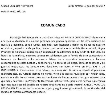 La Ciudad Socialista Alí Primera emitió un comunicado condenando este asesinato y pidiendo justicia. Sus vecinos también denunciaron ante la prensa lo sucedido.