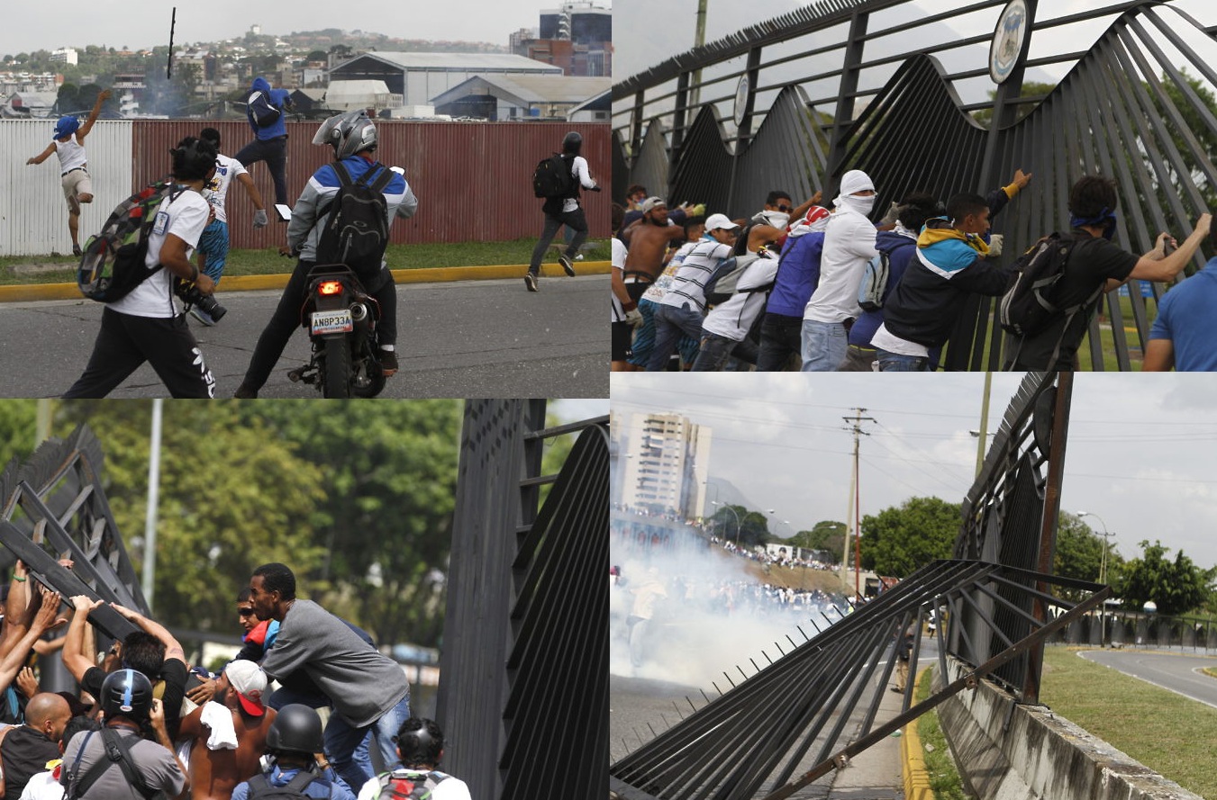 La violencia da lugar a imágenes como estas que condenaría cualquier Gobierno si ocurriese en su país. La primera muestra la secuencia del linchamiento a dos policías, uno de los cuales resulta gravemente herido. La segunda muestra como, tras las marchas del 19 de abril, manifestantes opositores tumbaron las vallas perimetrales de la Base Militar de la Carlota, las cuales utilizaron posteriormente como barricada cuando llegó la policía. Piensen que les ocurriría a estas personas en cualquier país democrático.