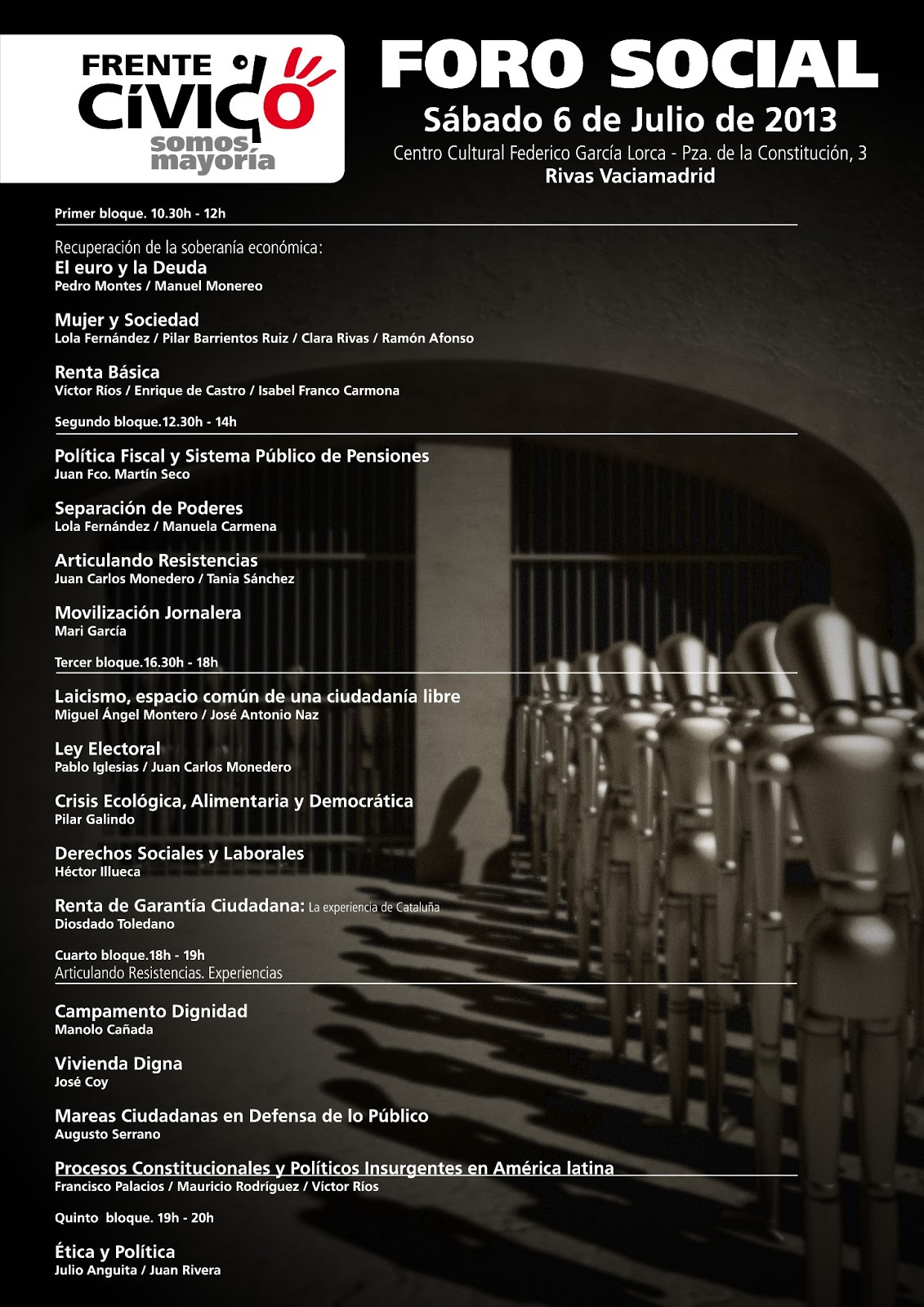 dvertir del peligro que entraña, en época de nostálgicos de la Dictadura, no tener un Estado fuerte y una sociedad fuerte movilizada para hacer cumplir los artículos recogidos en la Declaración de Derechos Humanos y los colectivos de la Constitución del 78. Recalcar la necesidad de organizar colegiadamente el combate político -cultural y la entente programática con el trabajo colectivo imprescindible de fuerzas políticas, confluencias, sindicatos, mareas, colectivos, ateneos, fundaciones… recogidas en el