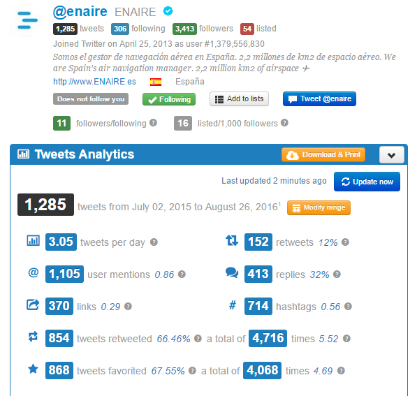 Aunque ENAIRE se unió a Twitter en Abril del 2013, no fué hasta el 2-7-2015, hace poco más de un año que nació la cuenta bajo la dirección técnica de INECO.