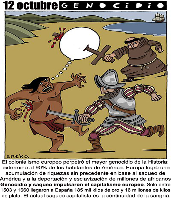 El 12 de octubre marca el inicio del saqueo que hasta hoy sigue empobreciendo a los pueblos de América para llenar las arcas de los saqueadores. Hasta hoy las multinacionales siguen explotando montañas y envenenando ríos, hasta hoy siguen talando bosques y fomentando mercenarios paramilitares para perpetrar masacres contra el pequeño campesinado, con la finalidad de desplazarlo forzadamente de las tierras codiciadas. Hasta hoy sigue el imperialismo europeo y estadounidense urdiendo golpes de Estado (golpe en Brasil, Chile, Argentina, Uruguay, Guatemala, Honduras, desestabilización contra el Estado venezolano, y un largo etc.); hasta hoy sigue el imperialismo urdiendo planes de exterminio contra las y los revolucionarios (Plan Lasso, Plan Cóndor, Plan Baile Rojo, Plan Colombia, Plan Patriota, Plan México, etc.); hasta hoy sigue la injerencia imperialista apuntalando regímenes genocidas como el colombiano, por citar un ejemplo paradigmático de régimen del Terror funcional al saqueo capitalista, mantenido a punta de masacres y exterminio contra la reivindicación social y política de la clase explotada.