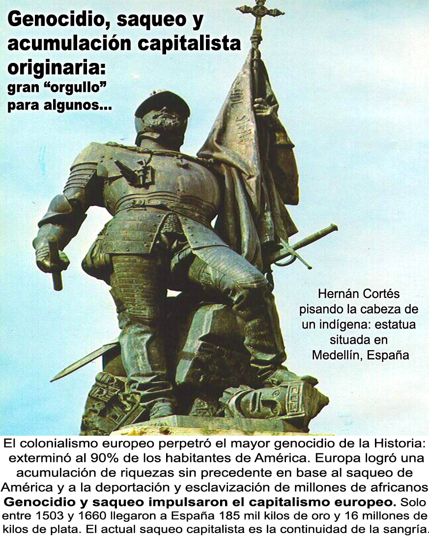 La persistencia de la negación del Genocidio por parte del imperialismo, está directamente relacionada con la perpetuación supremacista de las metrópolis capitalistas que siguen perpetrando saqueo y explotación. Al margen de las críticas que se le puedan hacer al gobierno de López Obrador, gobierno de corte socialdemócrata, que al igual que otros gobiernos mexicanos, no cuestiona al capitalismo, ni lo confronta nacionalizando las empresas estratégicas mexicanas hoy en manos de consorcios multinacionales, ni plantea siquiera aumentarles los impuestos (cuando por otro lado ya anuncia que se ve «impelido» a recortes sociales y laborales, aduciendo una supuesta escasez de presupuesto), al margen de todo esto, su sugerencia de unas disculpas por parte de la corona española y de la Iglesia levantan significativas costras. Y esas costras levantadas hay que analizarlas, por muy oportunistas que hayan podido ser las declaraciones de Obrador para tapar los recortes y la continuidad de la entrega de México al neocolonialismo capitalista. Aquí lo relevante es ver cómo la «corona» española, la Iglesia, las grandes fortunas descendientes de colonizadores y esclavistas, el imperialismo en pleno, resultan «furiosos» porque alguien ose referirse al genocidio sin medias tintas: el tamaño de su arrogancia es directamente proporcional al tamaño del ocultamiento histórico como parte de los mecanismos de dominación.