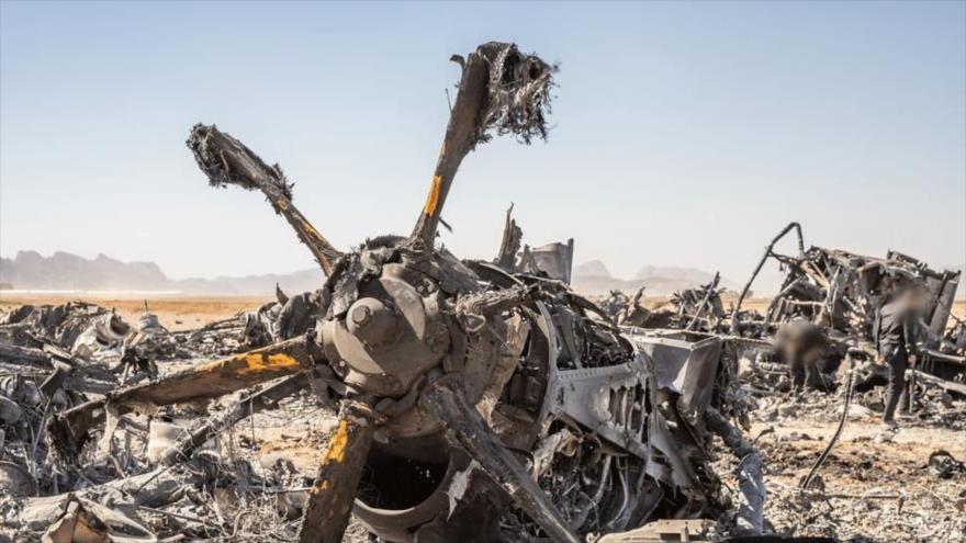 Según el vocero, ante la exitosa operación de cerco de las fuerzas iraníes, el enemigo se vio obligado a bombardear intensamente los aviones derribados, su equipo, sus comandantes y sus soldados “para evitar la deshonra del presidente de EE.UU. y la hegemonía vacía de su ejército”.