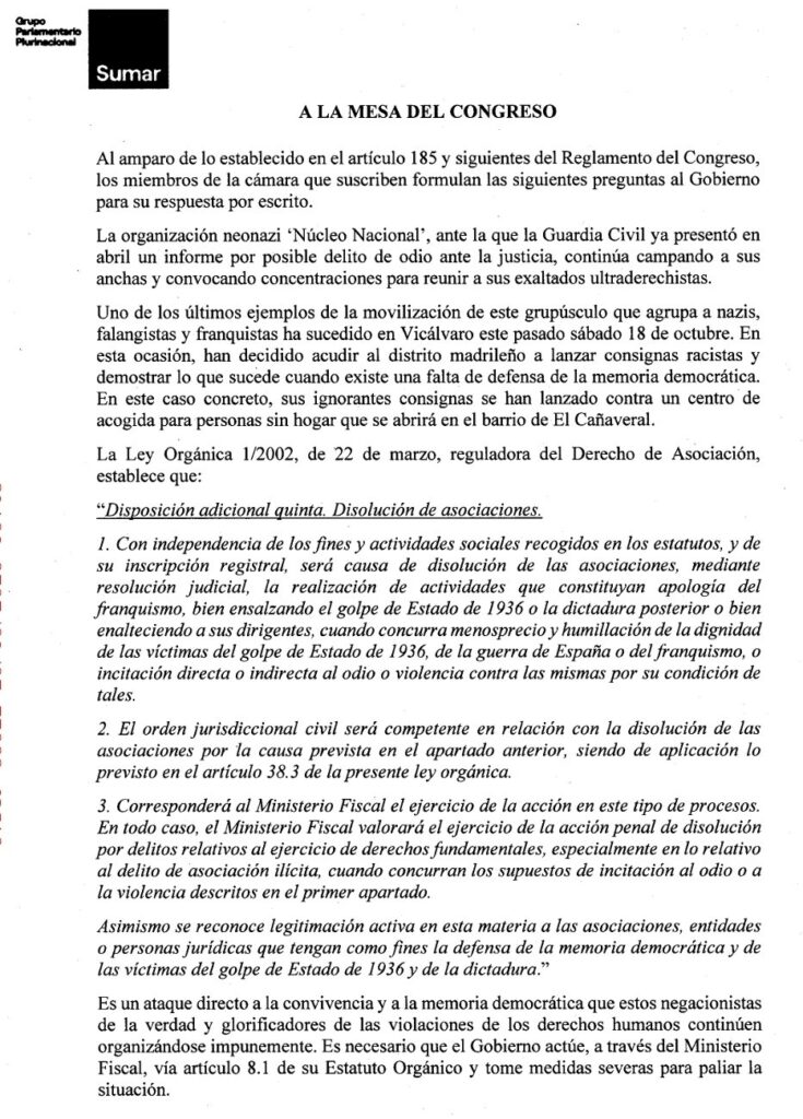 “Los diputados y diputadas de Izquierda Unida hemos pedido al Gobierno que inicie el trámite de disolución de la organización racista y fascista Núcleo Nacional”;