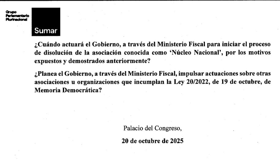 En su petición, IU exige que el Gobierno remita al Congreso un informe detallado sobre qué información maneja sobre la organización, qué trámites ha seguido el Ministerio competente y qué medidas está dispuesto a adoptar para garantizar la disolución y prohibición de actuaciones de Núcleo Nacional. Asimismo, reclama que se adopten medidas preventivas para evitar que otras formaciones de corte idéntico consigan inscripción o financiación pública.